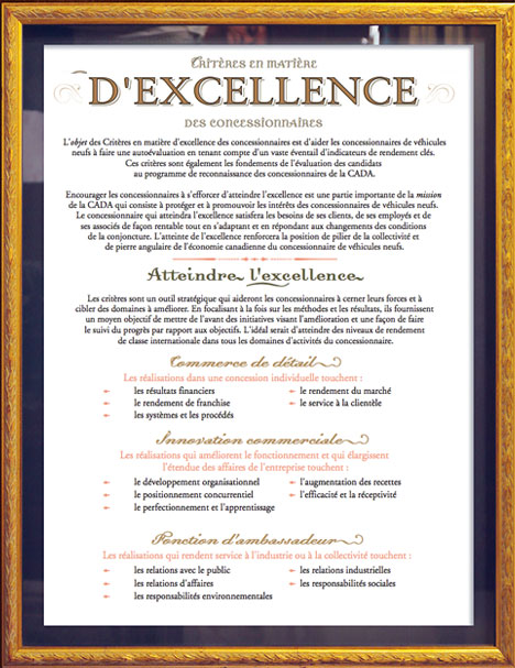 Critères en matière d’excellence des concessionnaires. Vous trouverez une explication détaillée et des exemples de rendement exceptionnel pour chacune des trois catégories dans les Guides des critères pour la