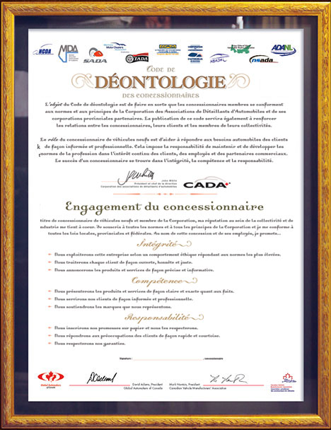 Charte de la CADA est la norme de référence par rapport à laquelle les candidats officiels sont évalués. Créée par et pour les concessionnaires, la
